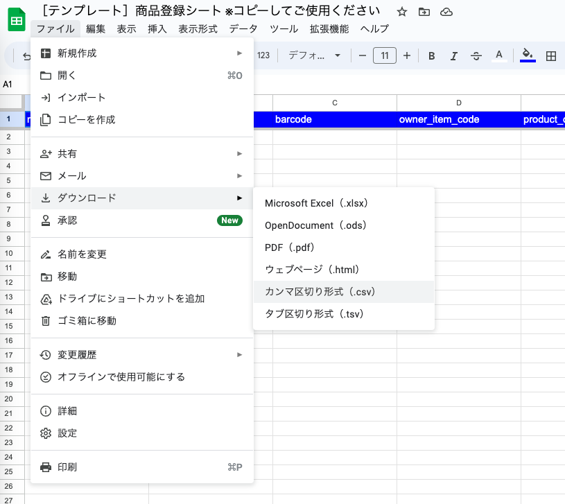 ファイル>ダウンロード>カンマ区切り形式(.csv)をクリックしてください
