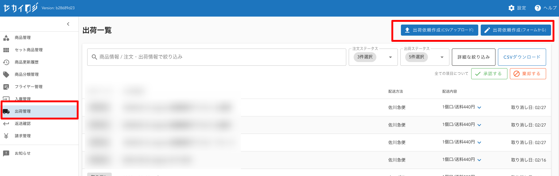 詳細は別記事「1-1. CSVによる出荷依頼の手順」を参照ください。