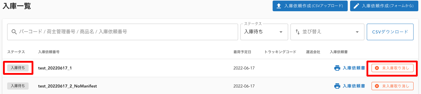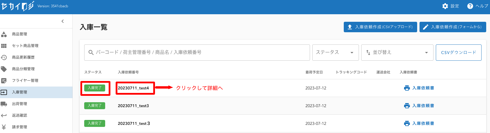 すべての入庫依頼内のすべての処理が完了(未入庫数が0)すると、ステータス欄が「入庫完了」に切り替わります。