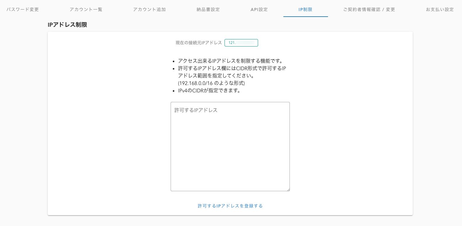 - ホワイトリストに指定するIPアドレスを記載し、「許可するIPアドレスを登録する」をクリック