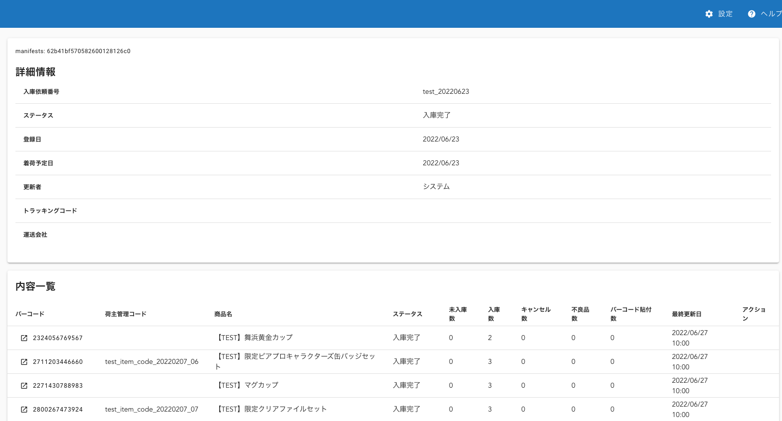 入庫依頼を行ったリクエストのステータスを入庫依頼番号ごとに一覧で確認できます。