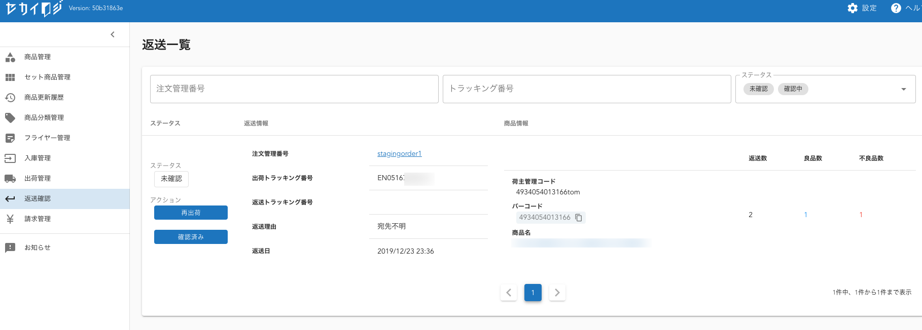 返送を倉庫側で検知すると、返送一覧にて通知されます。