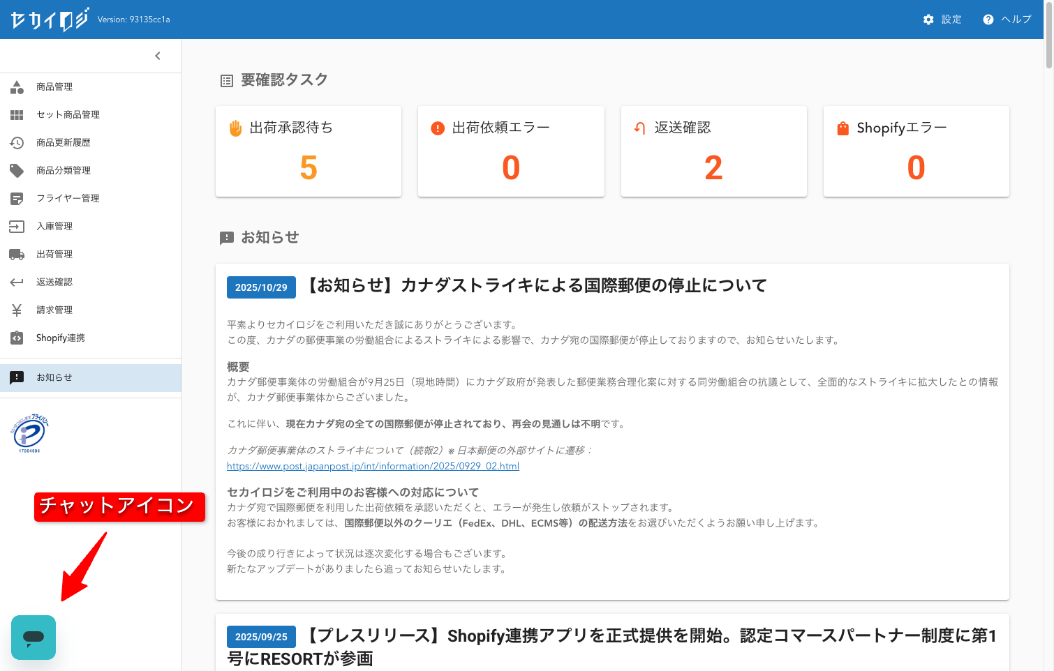 「セカイロジチャットサポート」は、荷主様がセカイロジログイン後の画面から直接問い合わせいただくことができる機能です。
