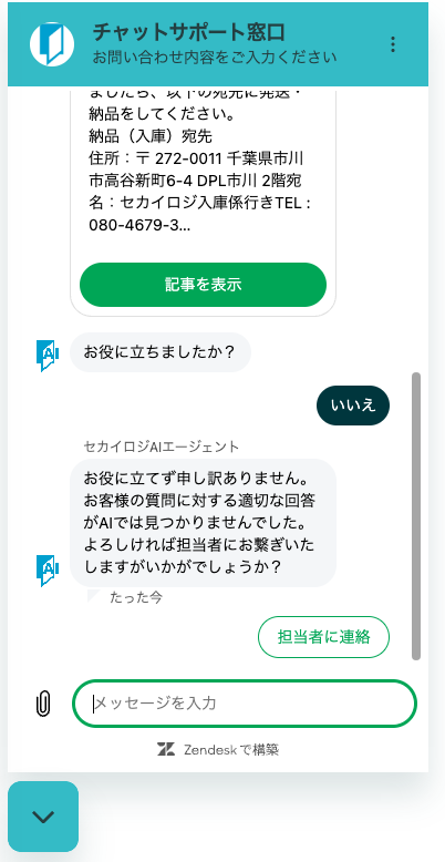 AIエージェントが回答できない場合や、回答がお役に立てない場合には、担当者への連絡ボタンが表示されます。