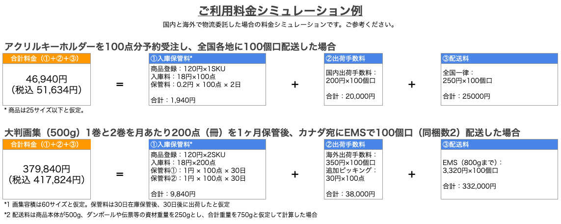 なお、入庫保管料、出荷手数料、配送料の詳しい説明については、「2. 入庫保管料」「3. 出荷手数料」「4. 配送料」の各記事をご参照ください。