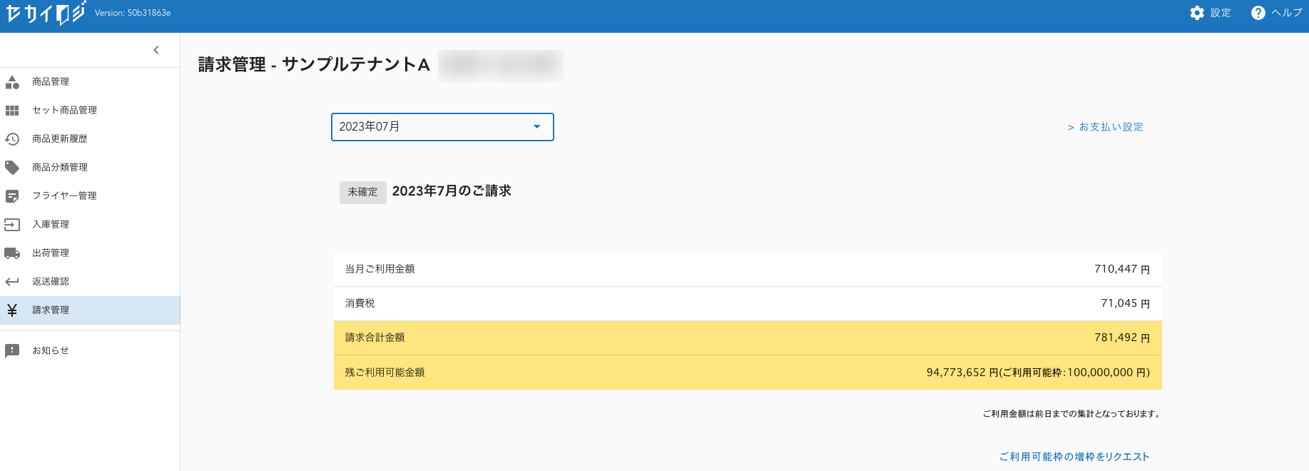 荷主様ごとに設定されたご利用可能枠に対して、未精算金額を差し引いた残ご利用可能金額が表示されます。ご利用可能枠についての詳細は、以下記事をご参照ください。