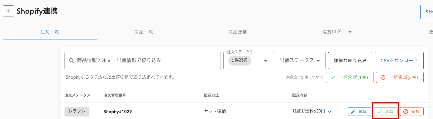 Shopify注文一覧でドラフト状態の依頼は個別または一括承認の操作を行うことで運輸キャリアのチェックと同時に倉庫側に出荷データが転送され、「出荷作業中」のステータスに切り替わります。