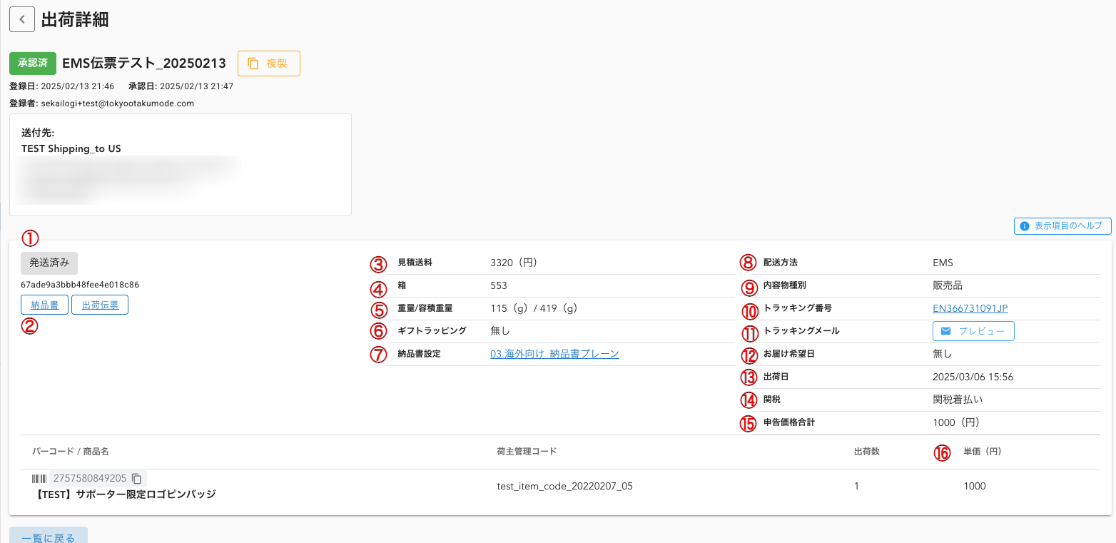 | ⑬ | 出荷日 | 出荷が完了すると、完了時点の日時が記録されます。 |