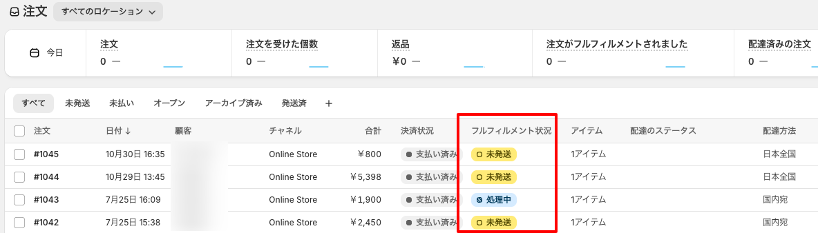 以下、Shopify管理画面のフルフィルメント状況を基準とした出荷ステータスの流れをご説明します。